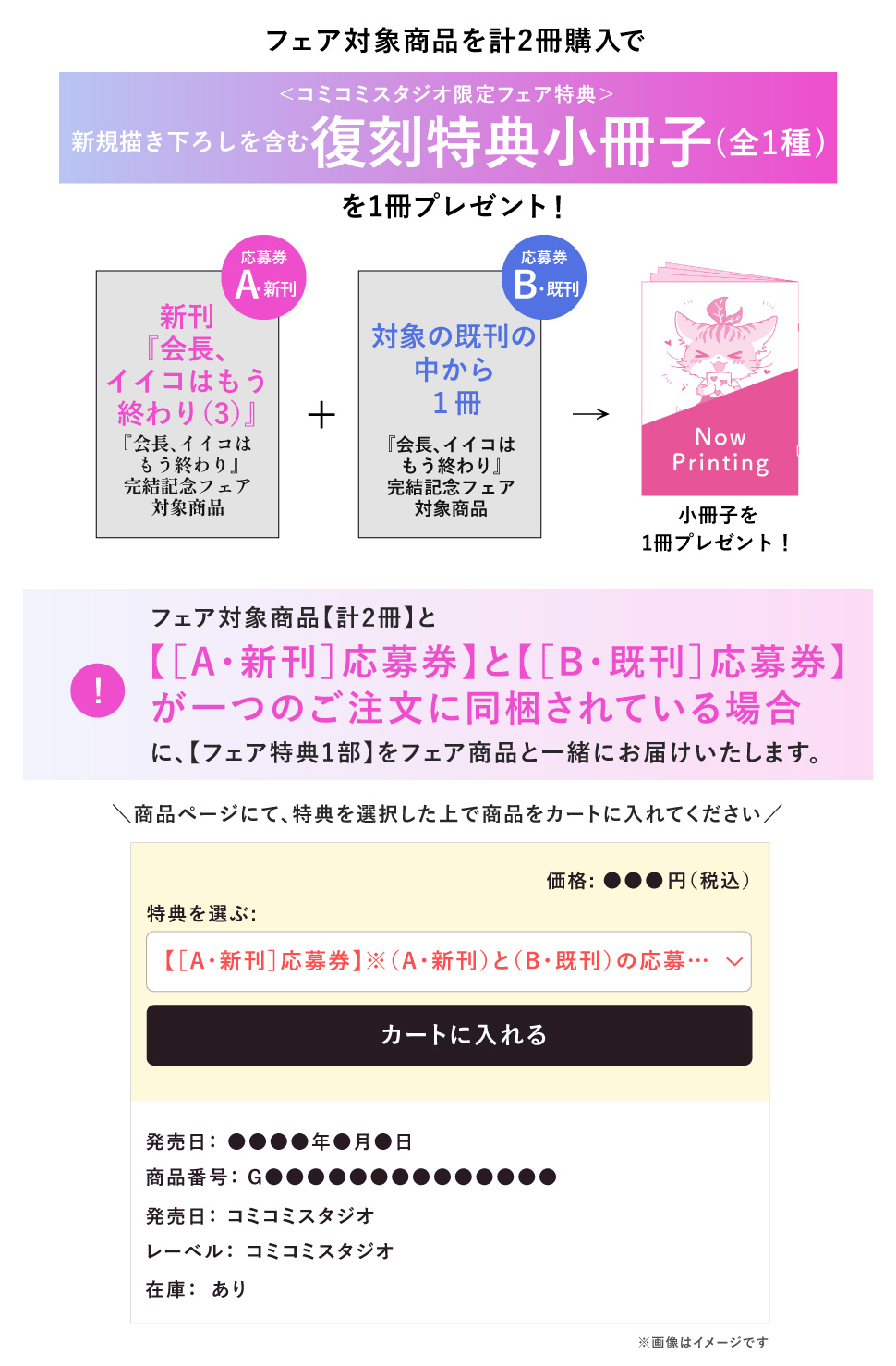 - 新刊『会長、イイコはもう終わり3』1冊とフェア対象既刊コミックス1冊をご注文いただく際、商品と一緒にカートへ応募券をお入れください。