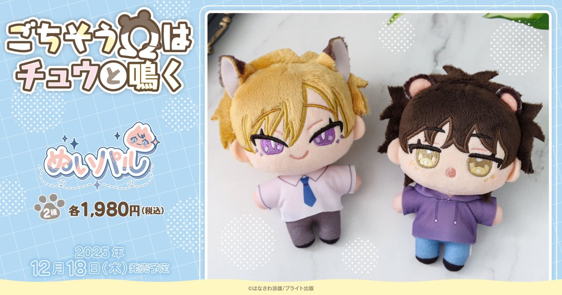 《ごちそうΩはチュウと鳴く」ぬいぐるみ&グッズ各種、好評お取り扱い中!》