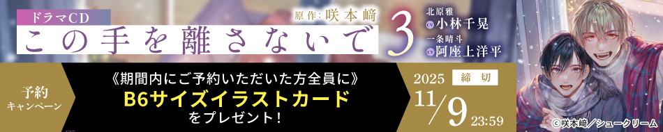 著者: 咲本﨑  メインキャスト: 北原雅:CV小林千晃、一条晴斗:CV阿座上洋平、北原大和:CV佐藤悠雅  受付期間:2025/11/09 23:59終了  New CD