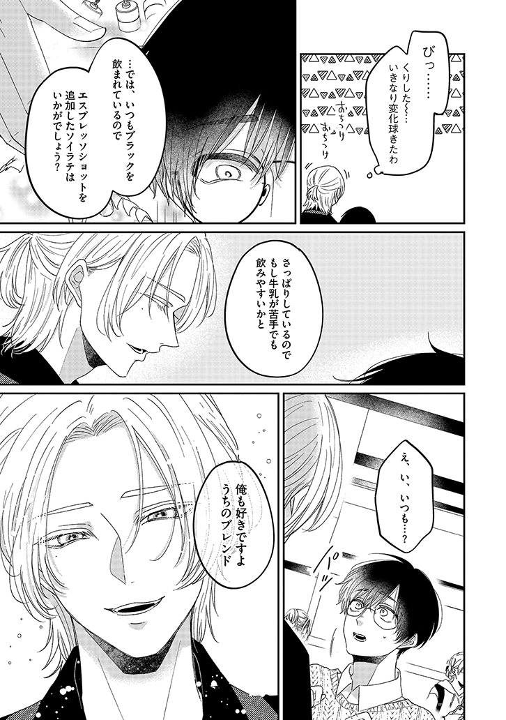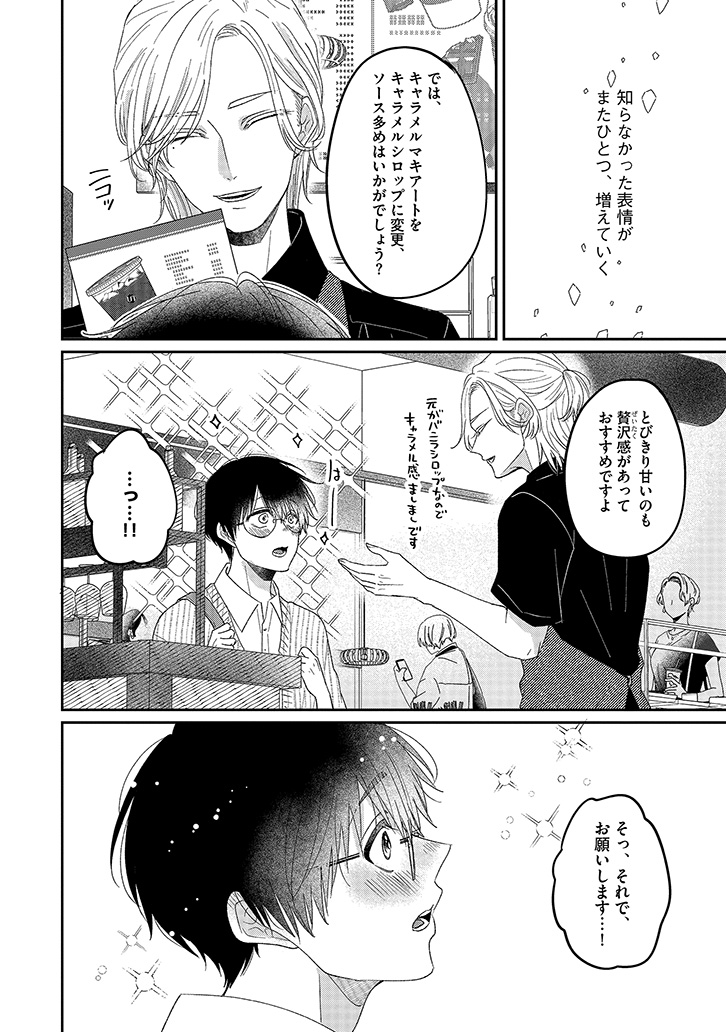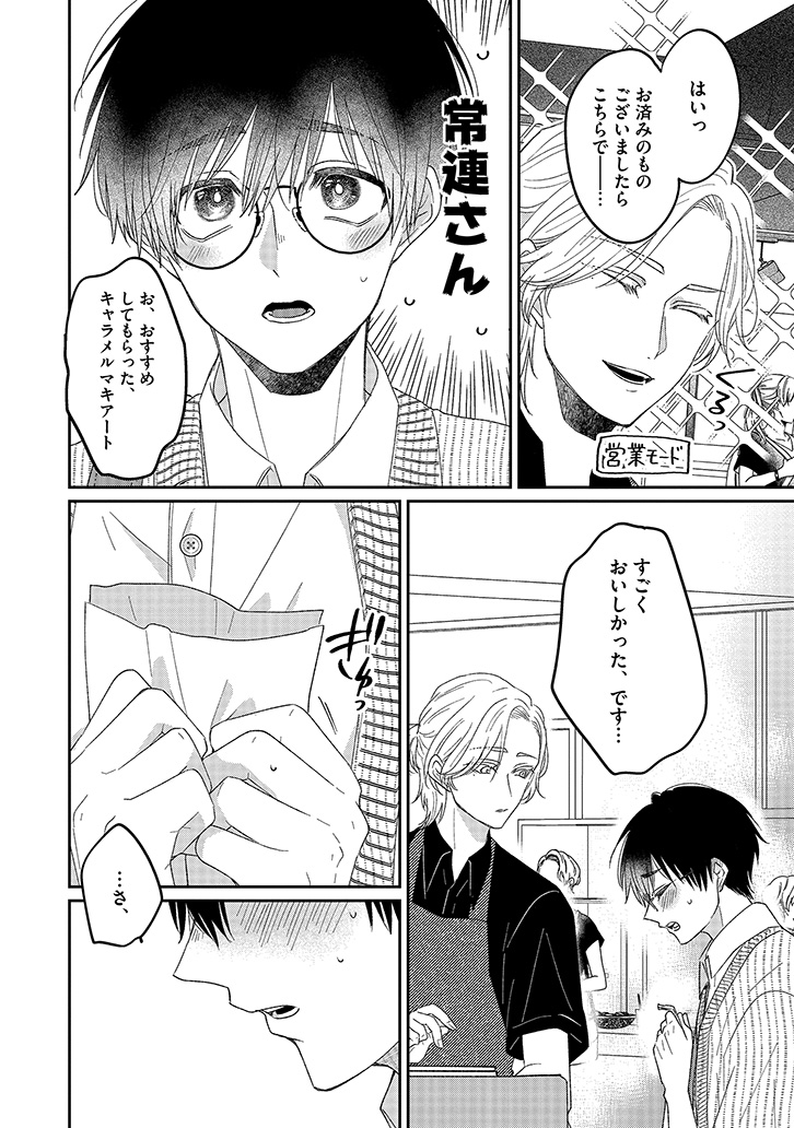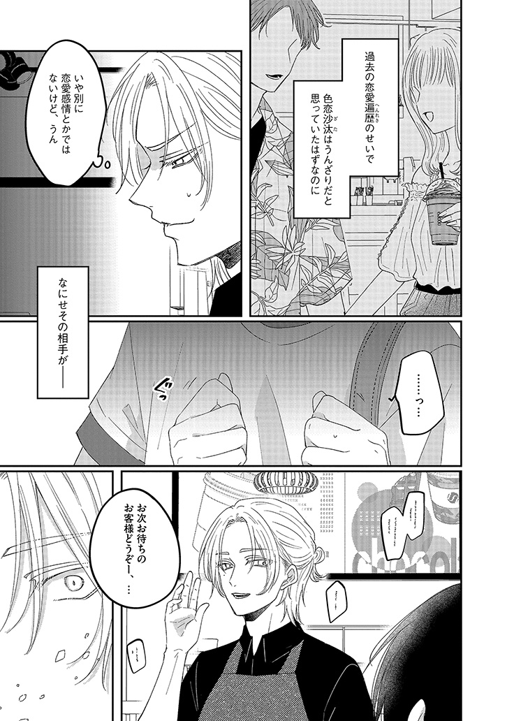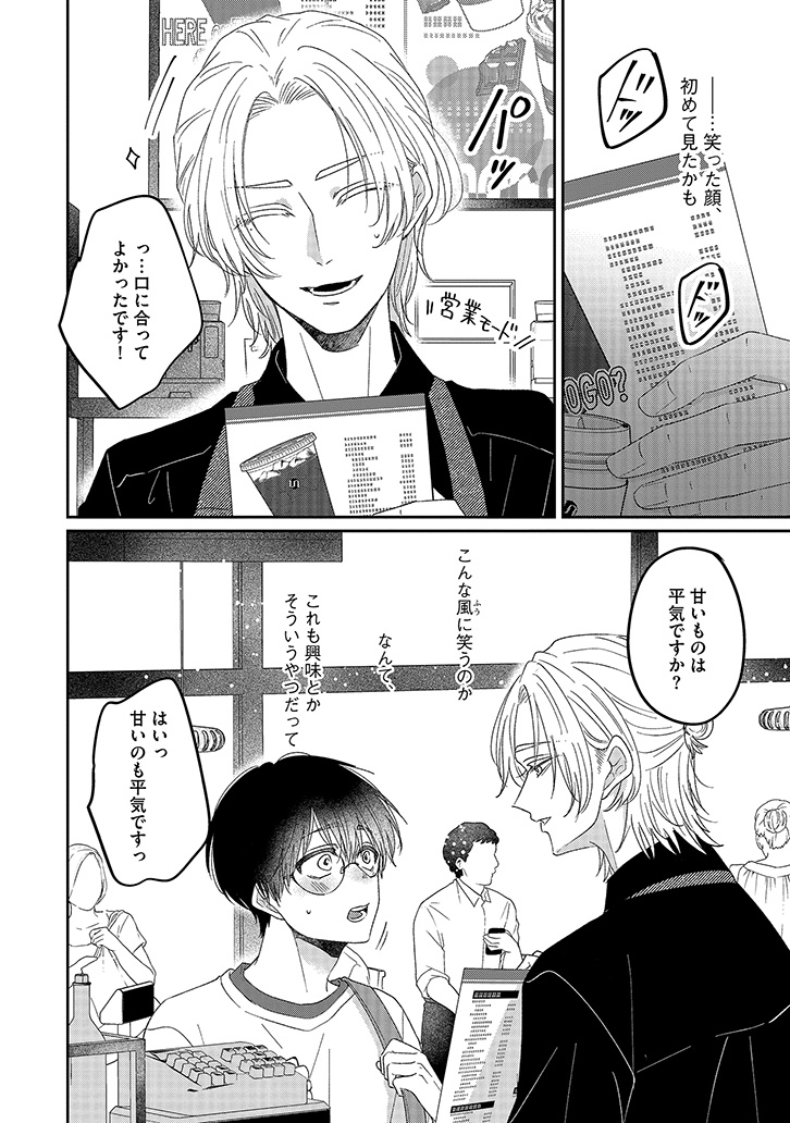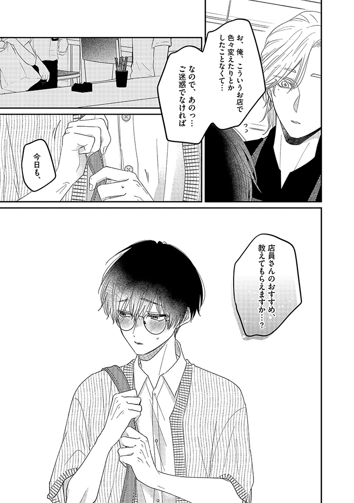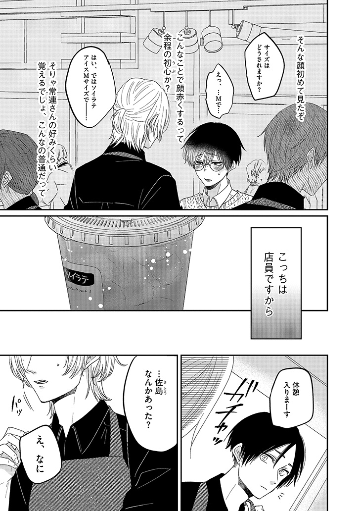 おすすめカスタマイズを幸せそうに味わう、潮田の笑顔を見るのが一番の楽しみになっていた。けれど、店員と客としての逢瀬を重ねるうちに、もっと特別でいたい――そんな独占欲が膨らんでいく。ある日、大荷物を抱えた潮田と出会い、家まで送ることになって……?