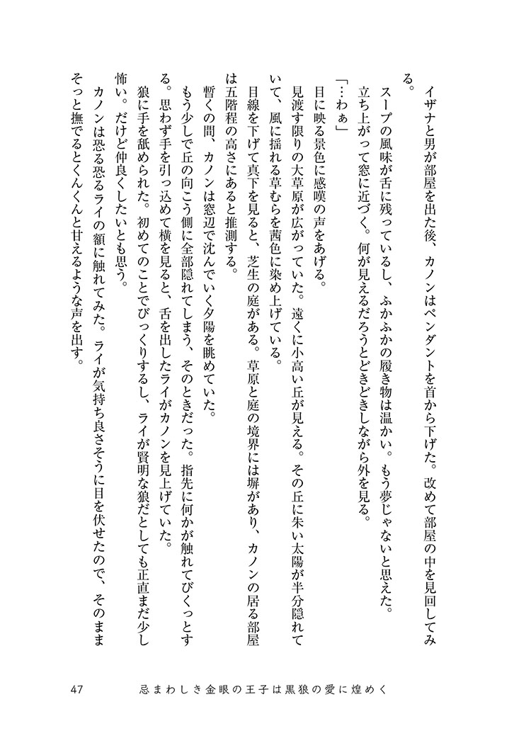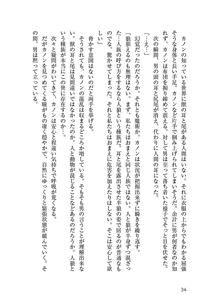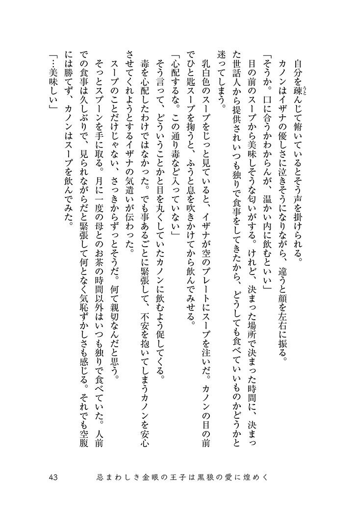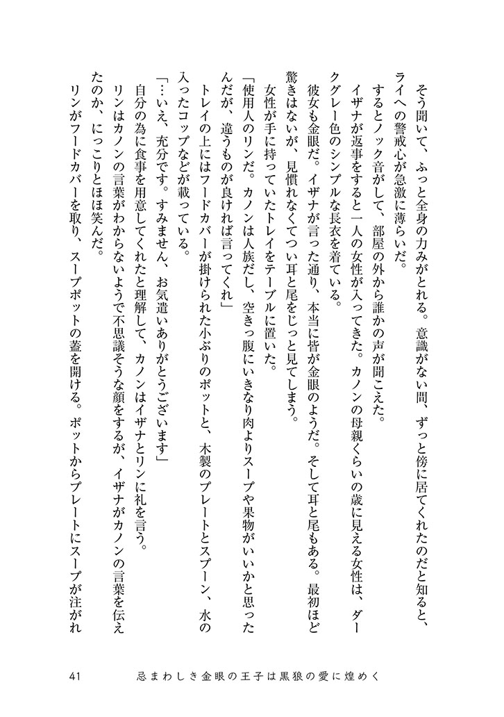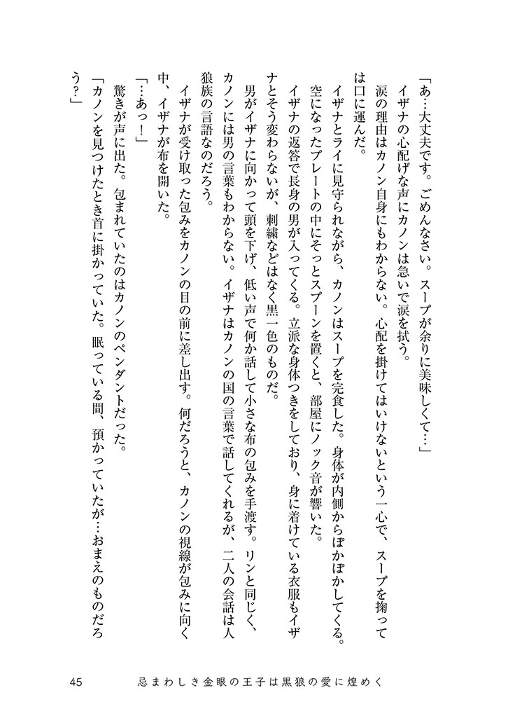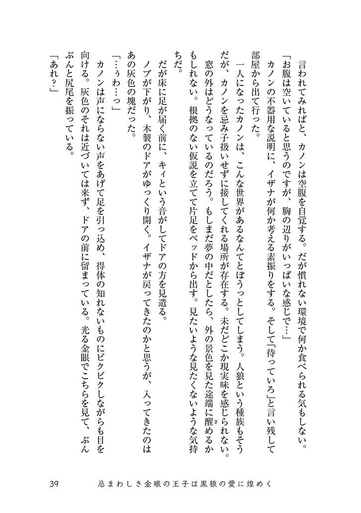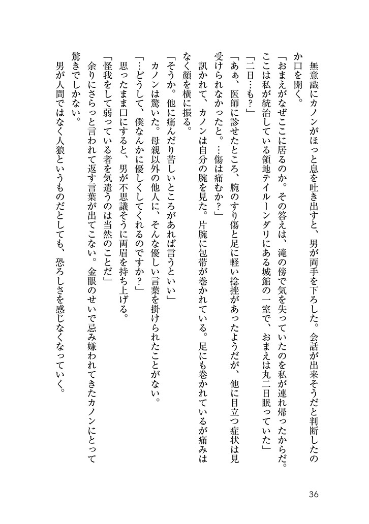 ヴァルミラ王国の第二王子、カノンは金眼のせいで悪魔憑きとされ、長年幽閉されていた。十八歳になると、父の命で崖から落とされ処刑されてしまう。しかし人狼族の領地の一つ、テイルーンダリの族長・イザナに命を救われ、彼のもとに身を寄せることに。イザナは寡黙そうな見た目によらず気さくで、政務の合間にカノンと食事をしたり、色々と気遣ってくれる優しい男だった。「なぜ悪魔憑きの僕に」と困惑しながら、カノンは彼に心を開いていく。領地での暮らしに慣れたある日、カノンが他領地の族長・アオギと楽しげに話していると、イザナがなぜか怒った様子で現れ…。