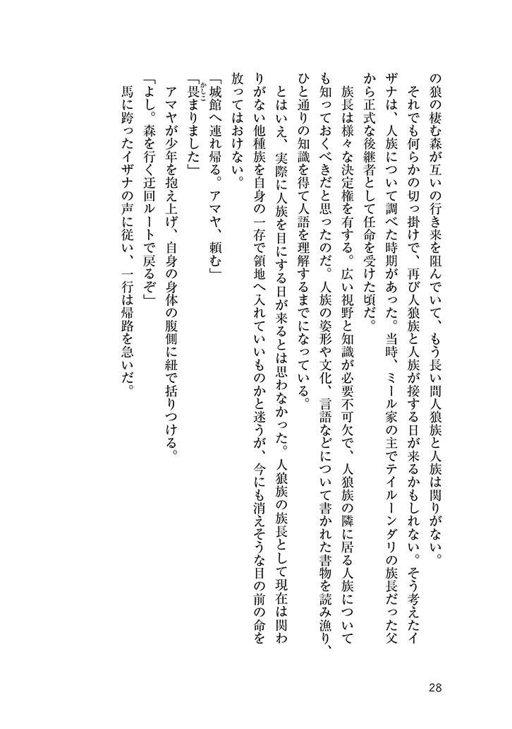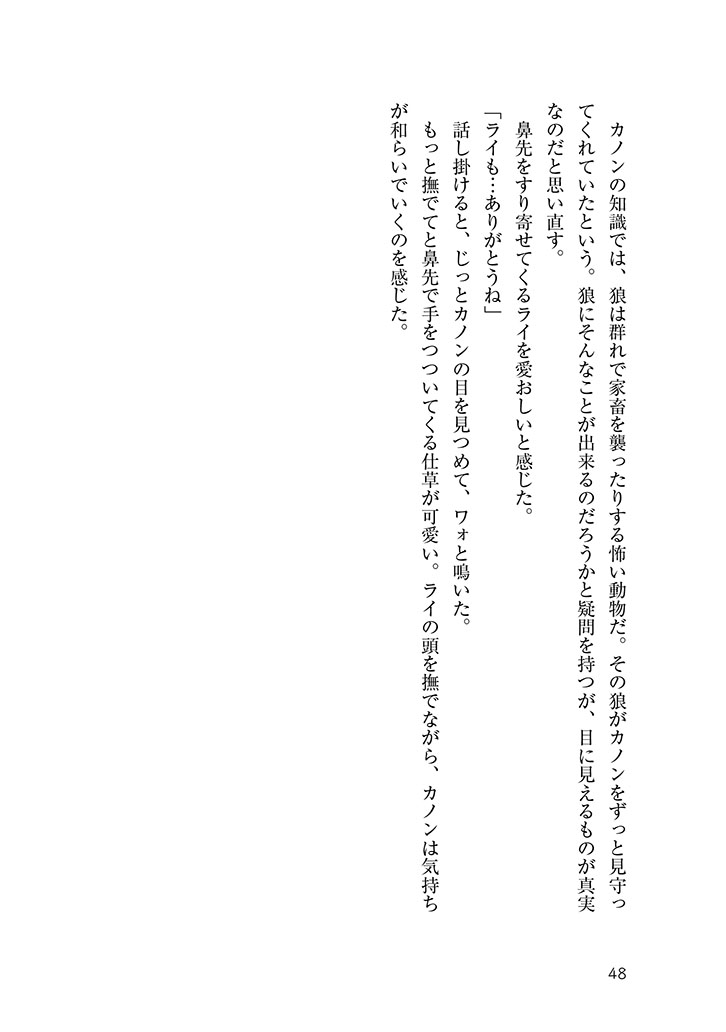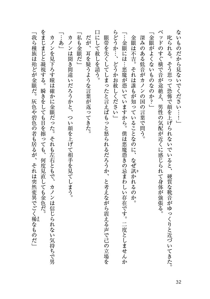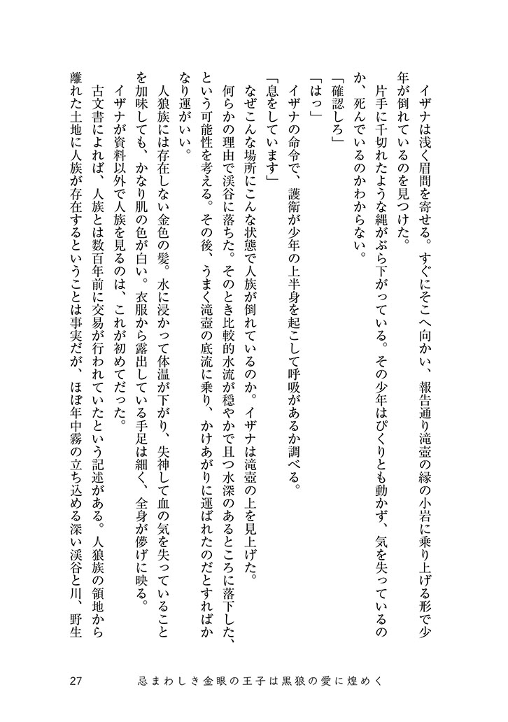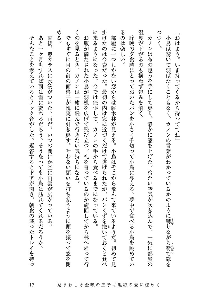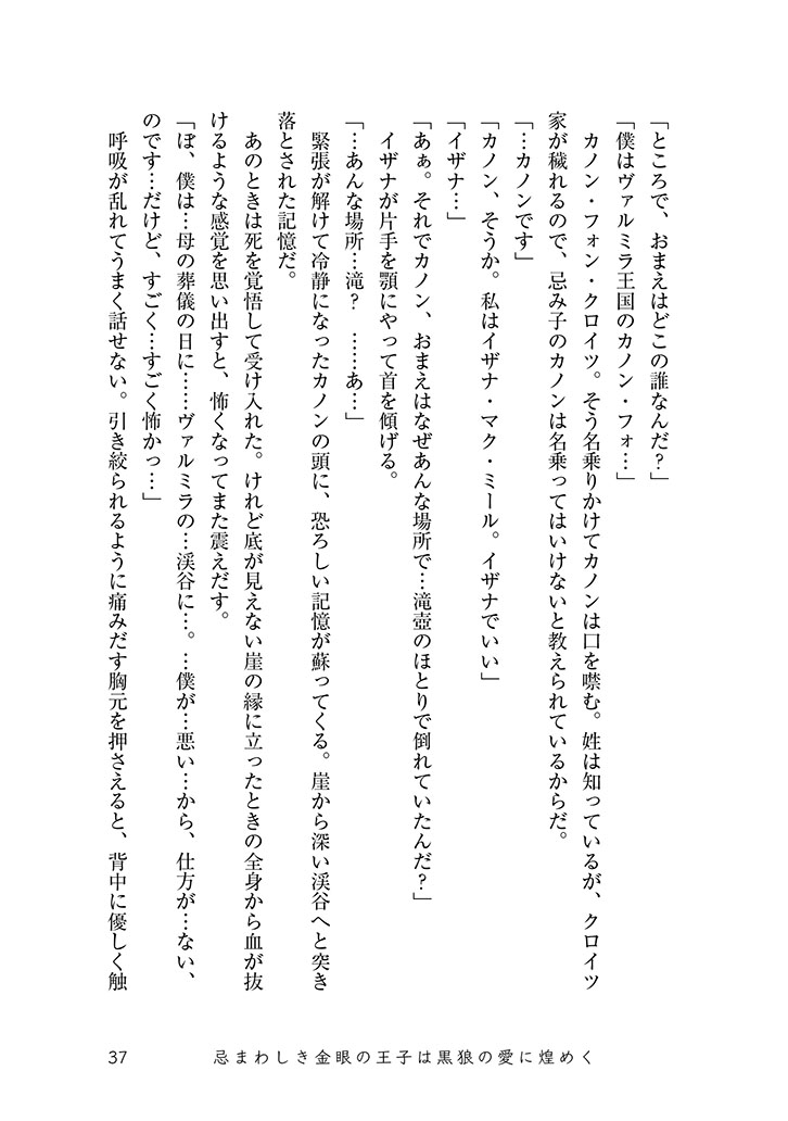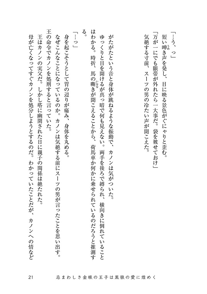 ヴァルミラ王国の第二王子、カノンは金眼のせいで悪魔憑きとされ、長年幽閉されていた。十八歳になると、父の命で崖から落とされ処刑されてしまう。しかし人狼族の領地の一つ、テイルーンダリの族長・イザナに命を救われ、彼のもとに身を寄せることに。イザナは寡黙そうな見た目によらず気さくで、政務の合間にカノンと食事をしたり、色々と気遣ってくれる優しい男だった。「なぜ悪魔憑きの僕に」と困惑しながら、カノンは彼に心を開いていく。領地での暮らしに慣れたある日、カノンが他領地の族長・アオギと楽しげに話していると、イザナがなぜか怒った様子で現れ…。